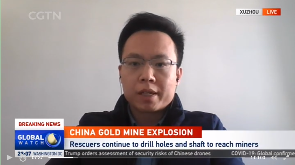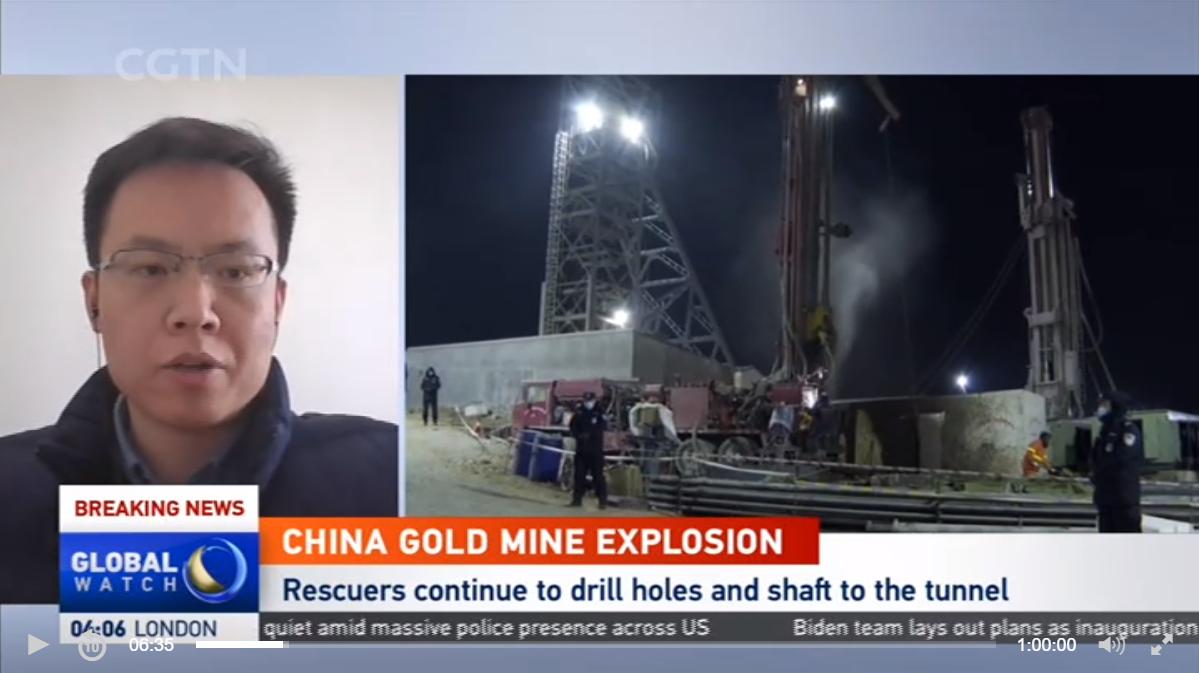 自事故发生后,中央电视台对事故救援情况进行了跟踪报道。1月18日和19日,中国环球电视网(CGTN,原央视英文频道CCTV-NEWS)在中午1200~13:00时段播出的Global Watch节目中邀请我校矿业工程学院副教授李许伟就事故救援情况进行了评述。李许伟副教授分别就主持人提出的事故救援当前的进展情况、预计救出被困人员所需的时间、救援过程中遇到的主要挑战、如何保证被困人员的身体和精神状态等问题进行了专业的分析和解答,从而为观众了解救援工作进展情况提供了专业信息。